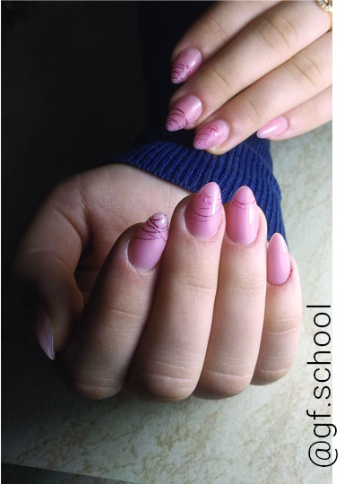 Gossamer has a very wide range of uses. The design options with the "spider web" gel can be very different, but the most popular are an abstract pattern of thin threads and geometry. You can always diversify the design by adding decor on top of the "cobweb" (rhinestones, rivets, three-dimensional jewelry) or under it on the background (kamifubiki, foil, etc.). You can draw lines of any shape: straight, semicircular, curved, angular and others.